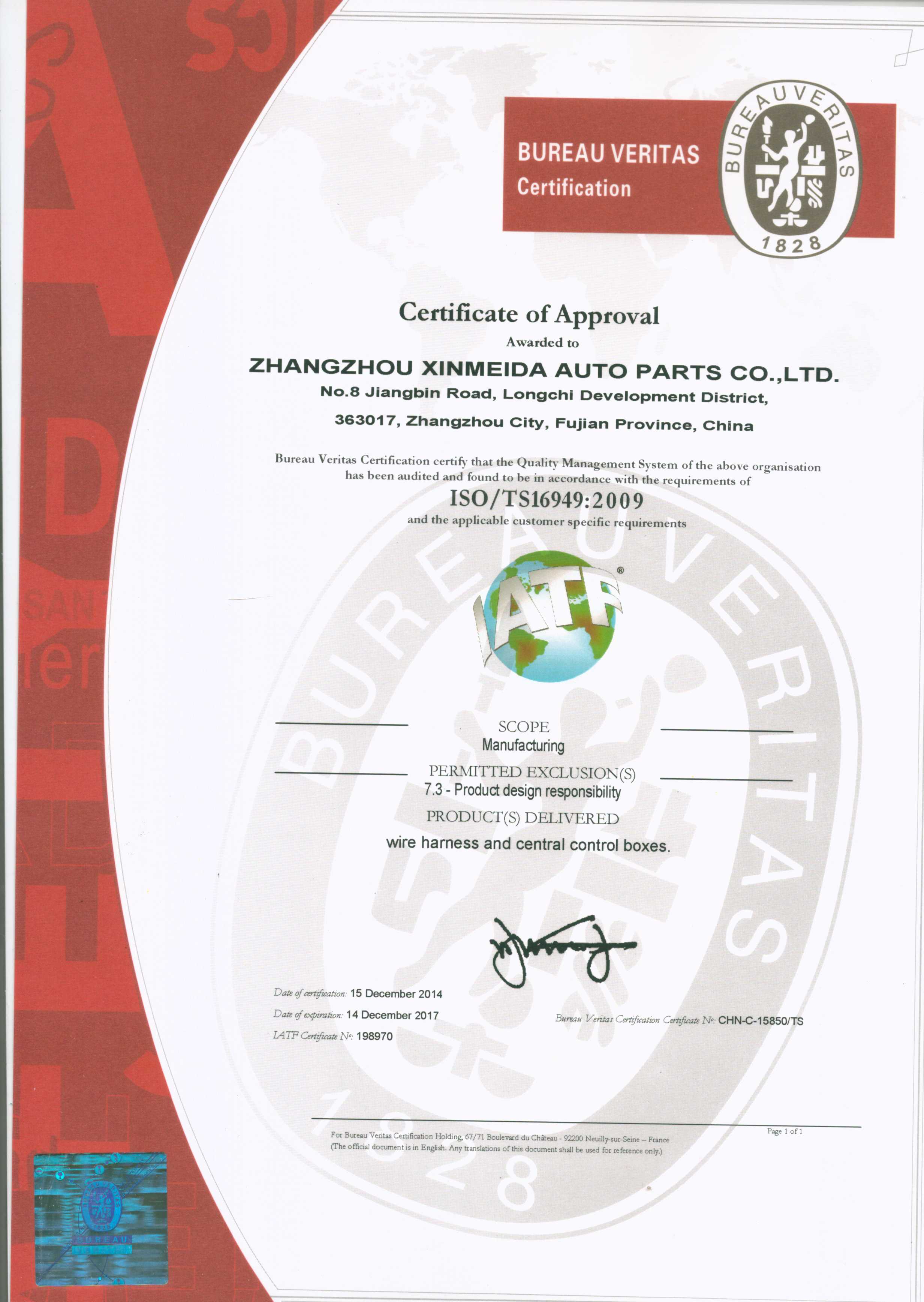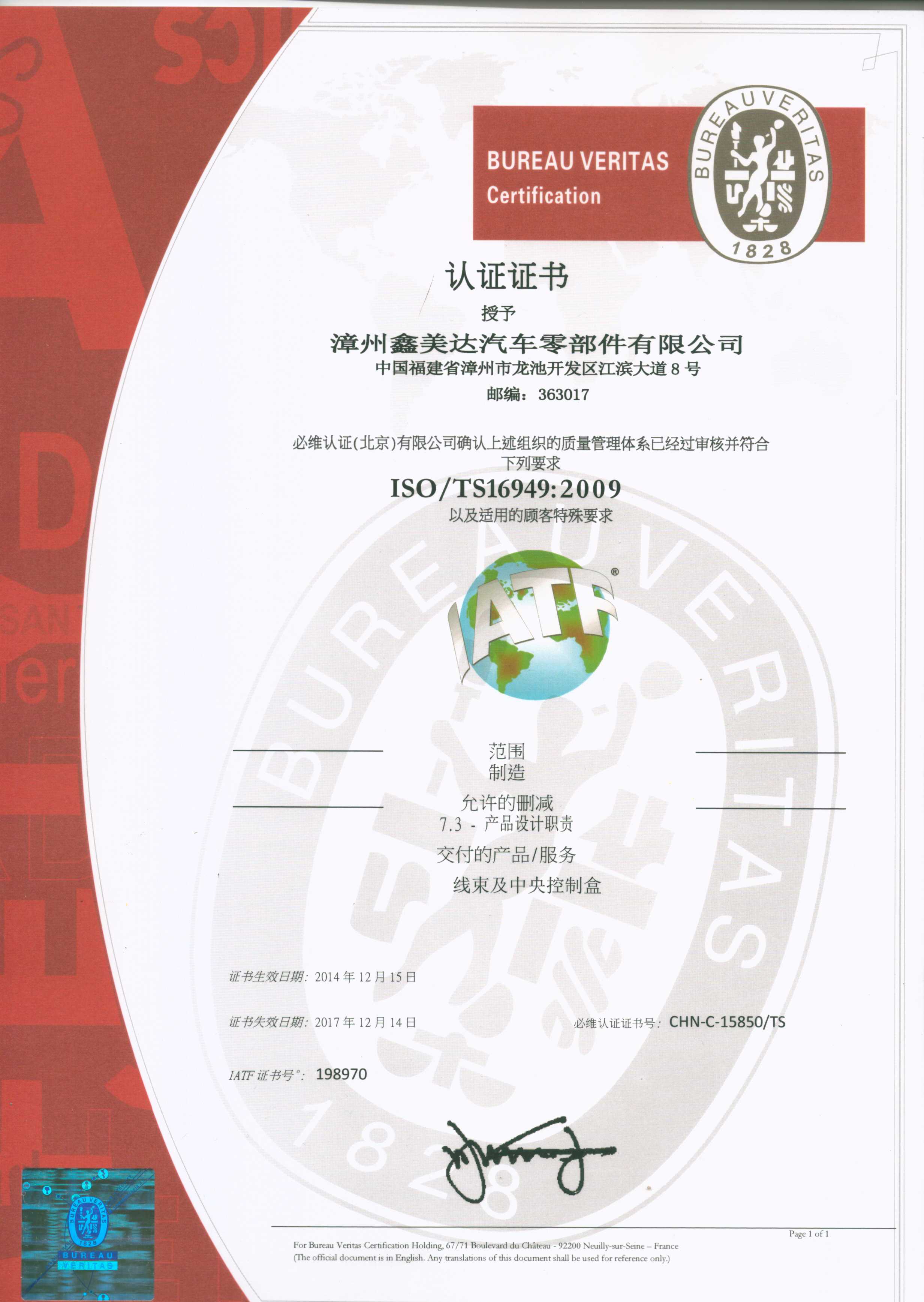 鑫美达TS16949认证证书 英文